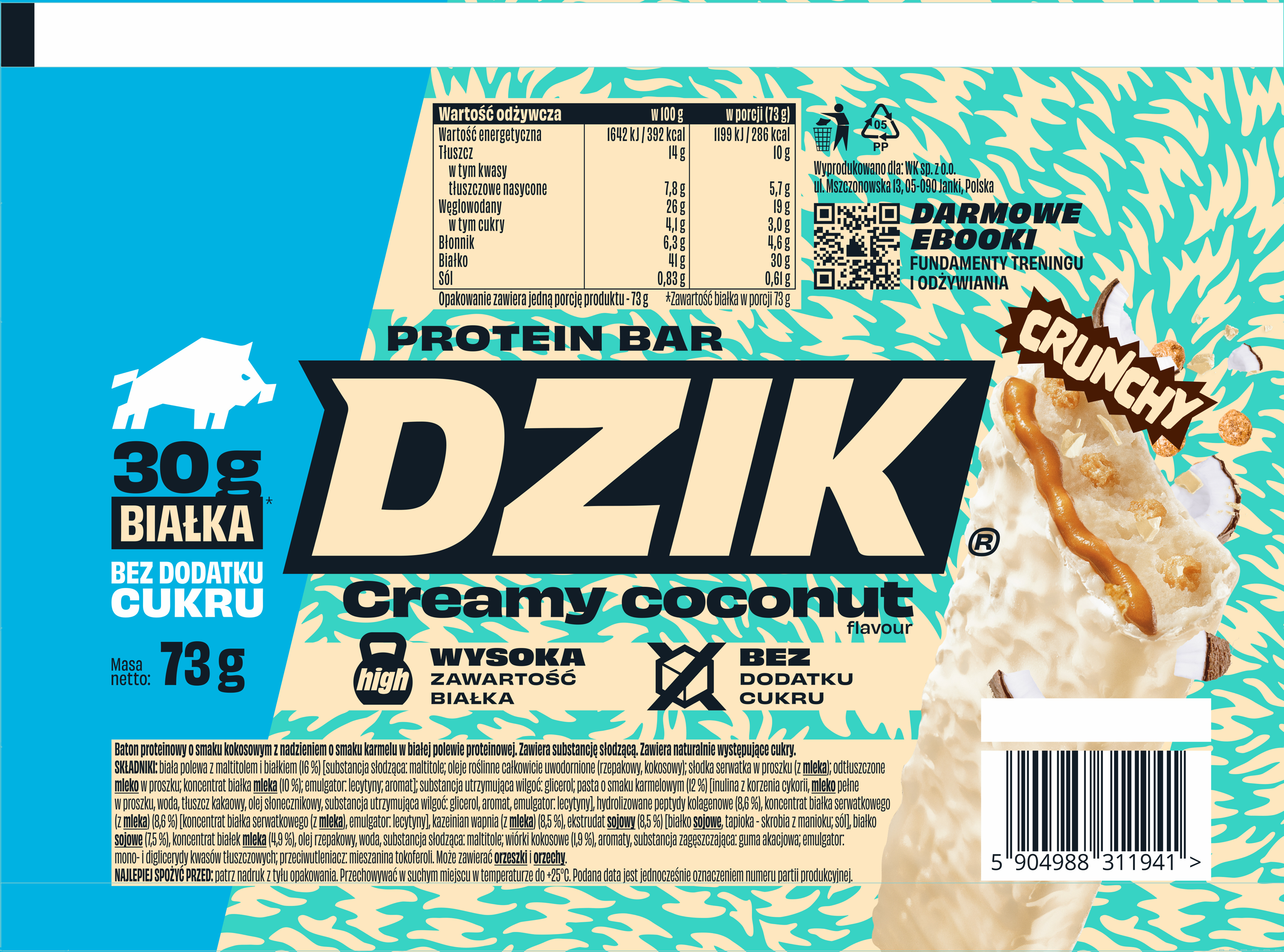 Nowa era batonów proteinowych. 30 g białka i 10 g tłuszczu w jednym chrupiącym batonie DZIK® (73 g)