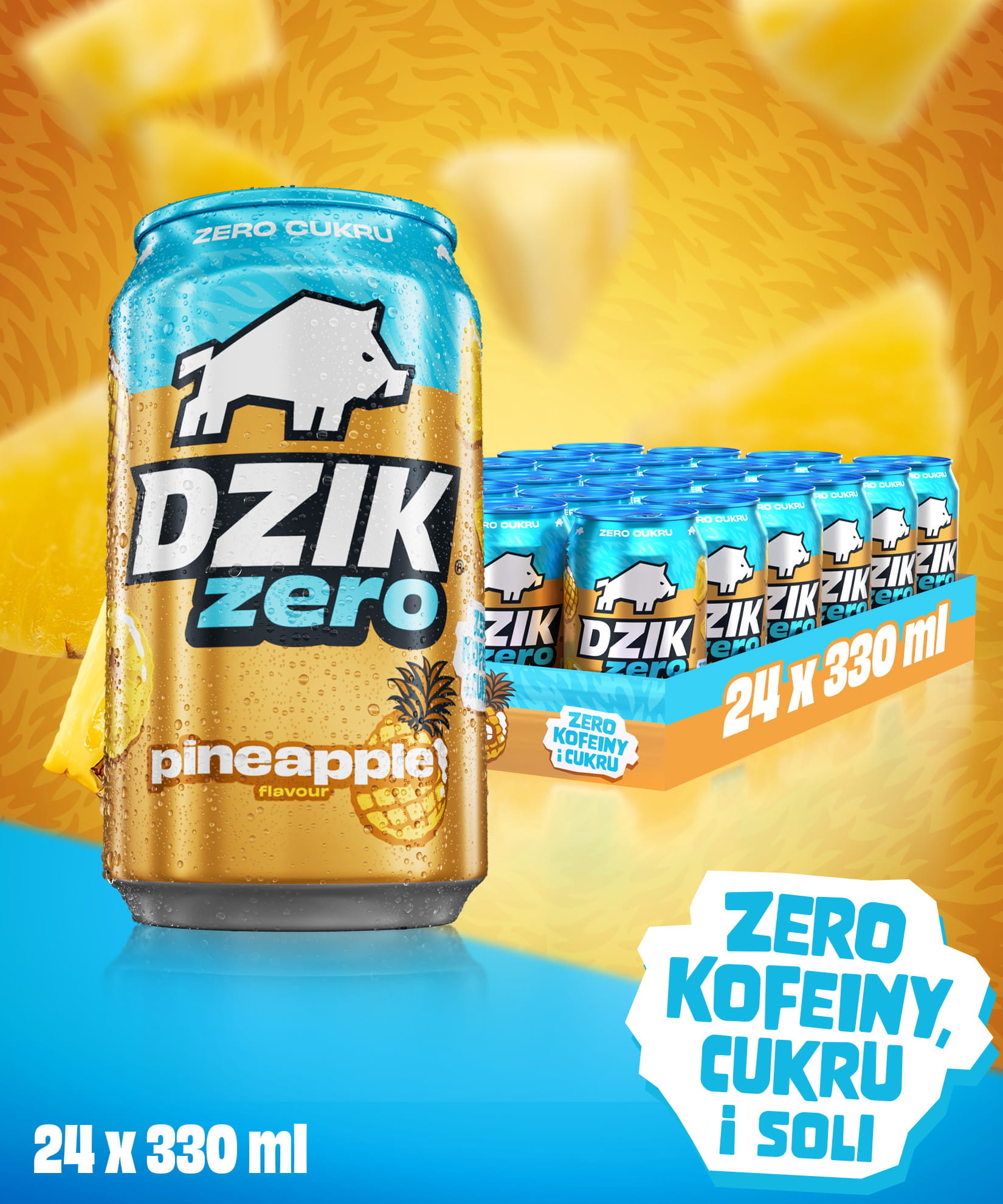 Dla tych, którzy uwielbiają napoje gazowane, ale chcą dbać o sylwetkę i zdrowie: DZIK® ZERO o pysznym, ananasowym i orzeźwiającym smaku, bez konsekwencji. Nasze napoje ZERO nie zawierają cukru, ani kalorii. Są bezpieczne dla osób na redukcji i każdego, kto stara się ograniczyć spożycie cukrów. Owocowe napoje gazowane DZIK® ZERO nie zawierają także kofeiny, a więc mogą być spożywane przez osoby w każdym wieku. To, co dodatkowo je wyróżnia to brak barwników. Największym atutem jest jednak smak: idealnie wywarzona słodycz i orzeźwienie zamknięte w małej, wygodnej puszce 330 ml.